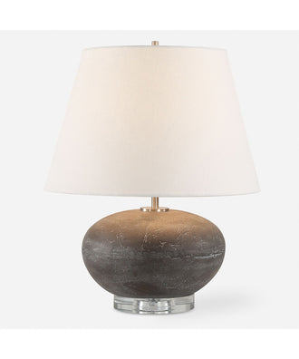 The Beckley Gray Stone Table Lamp is a stunning addition to any home decor. Its ceramic base is finished in a distressed charcoal glaze, giving it a unique stone-like texture that exudes sophistication. The bronze highlights add a touch of warmth and elegance, making this lamp a perfect blend of rustic charm and modern design. The thick crystal foot and plated nickel hardware further enhance its luxurious appeal, ensuring that it stands out as a statement piece in any room.
