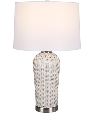 Perfect for a coastal home, this beautiful woven rattan table lamp is finished in white with brushed nickel accents. A light and airy feel, this crisp look is complemented with a slightly tapered white linen shade.