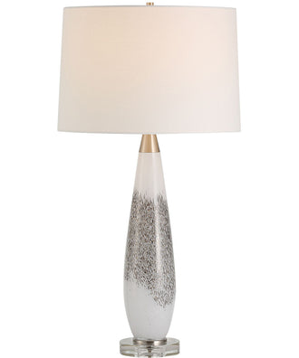 This sleek and slender glass base features a brilliant white background with mottled gray and metallic silver details displayed on a thick crystal foot and paired with plated brushed nickel accents.