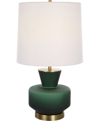 The Trentino Dark Emerald Green Table Lamp is a stunning addition to any home, inspired by mid-century modern design. Its unique shape features a dark emerald green glass base that exudes sophistication and elegance. The base is accented with lightly antiqued brass-plated details, adding a touch of vintage charm. This lamp stands at 28 inches in height, making it a perfect statement piece for your living room, bedroom, or office.