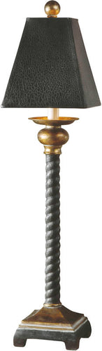 A buffet lamp has different proportions than a regular table lamp. A buffet lamp is taller and slimmer, with a shade which isn't as wide. The tall narrow profile makes it ideal for being positioned on a buffet or narrow side-table, such as in a hallway where there isn't much room. This also reduces the risk that it will be knocked over.