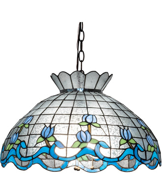 Grace your home with the exquisite 20" Wide Roseborder Pendant, a stunning piece that embodies elegance and sophistication. This pendant light features an exquisitely crowned shade, meticulously crafted to add a touch of class to any room. The design showcases a gridwork of Winter-kissed Icy Clear Fern Glass, which is adorned with a Wedgewood Blue border of swirling ribbons and Blue Waterglass rosebuds. These elements are further complemented by Green Leaf accents, creating a harmonious blend of colors and textures that exude timeless beauty.