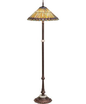The floor lamp boasts a rich Mahogany Bronze finish on its elegant cast metal base, adding a touch of sophistication to any space. The vivid colors of the stained glass shade create a mesmerizing display of light and color, making this lamp a true statement piece.