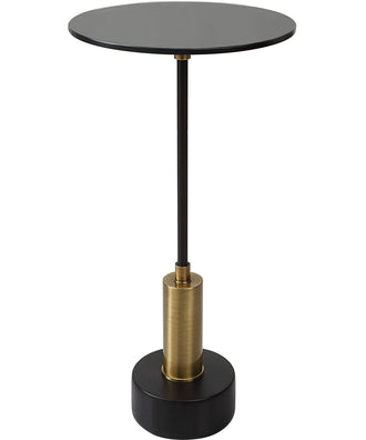 Elegant and sophisticated, this round accent table features a brushed brass and satin black iron base with black marble details and a black glass top.