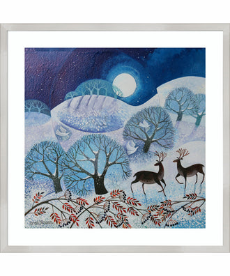 ART DESCRIPTION: In the stillness of a winter night, majestic deer frolic beneath a stand of trees. The snow-covered ground is illuminated by the soft glow of the moon, while white doves flutter amongst the hills. This Amanti Art framed art print was created by Lisa Graa Jensen and printed by Amanti Art in Madison WI. The print is giclee printed using fade-resistant inks for picture-perfect detail and incredible depth of color and finished with a 100% real wood frame. Individually made using traditional custom framing techniques, it has the quality you would expect from your local frame shop. Because of our attention to detail and focus on artistry, architects, interior designers, and homeowners alike choose this framed art print to create beautiful living spaces.