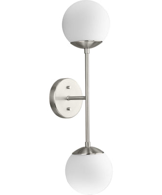 The wall bracket's fashionable design offers a chic statement to mid-century modern, contemporary and timeless modern settings. The wall bracket complements dining rooms, great rooms and bedrooms with its etched opal glass globes and bold linear lines. The fixture is coated with a subtle nickel finish, enhancing its modern design. Opal glass globe shades deliver bright illumination to spaces below. Mount the light fixture horizontally or vertically for more design flexibility. Measures 7.12-in width by 24-in. height, extends from wall 5.87-in. Uses (2) 60-watt candelabra base bulbs or LED equivalent, that is sold separately, and dimmable when used in conjunction with a dimmable bulb. Certifications: cULus Damp location listed, fixture can be used in rooms where moisture may be present. Warranty: Our 1-Year Limited Warranty guarantees your complete satisfaction with your purchase and includes professional after-sales customer service support. Includes installation instructions and mounting hardware for a quick, easy installation. This fixture is part of the Progress Lighting Design Series, a lighting collection offering fashionable styles and luxury lighting for the home