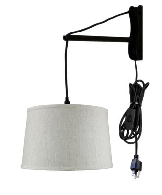 16"W MAST Plug-In Wall Mount Pendant 1 Light Black Cord/Arm Shallow Drum Textured Oatmeal Shade