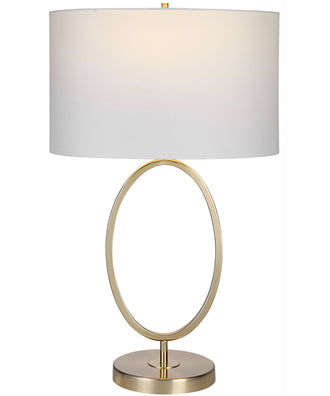 An oval center ring gives a feeling of openness to this unique table lamp. The metal base features a golden brass finish. It is paired with an oval hardback white linen shade.