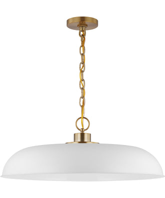 The Colony 1-Light Pendant in Matte White and Burnished Brass by Nuvo Lighting is a stunning addition to any home or office. This large pendant light features a sleek, modern design that combines the timeless appeal of matte white with the warm, luxurious touch of burnished brass. The fixture's clean lines and minimalist aesthetic make it a versatile piece that can complement a variety of interior styles, from contemporary to mid-century modern.