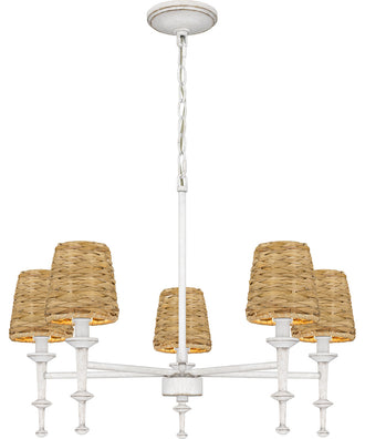 Part of the Quoizel Naturals collection, Flannery exemplifies modern bohemian style. The antique white finish is adorned with natural seagrass shades, adding a touch of coastal style to the soft silhouette. Choose the five-light chandelier, perfect over a kitchen table or in a breakfast nook - or add easy style to any hallway or bathroom with the Flannery wall sconce.