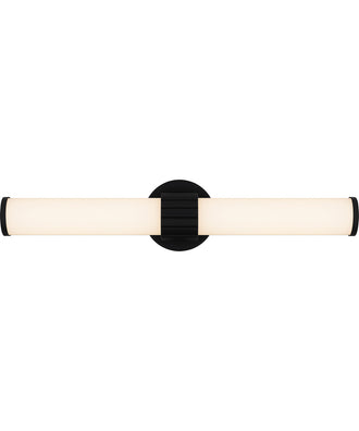 Upgrade your bathroom with the modern style of Kaye. An integrated LED light source shines brightly through the linear etched glass shade, complemented by sleek metal bands. Choose from a variety of sizes, available in your choice of matte black or aged brass. Part of the popular Platinum by Quoizel collection, Kaye bath lights are a perfect complement to modern or contemporary vanity spaces.