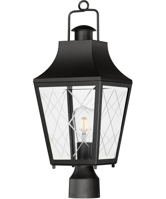 These charming cottage style lanterns feature unique cross-etched glass panels that are Clear and beveled along their edges. Additional design details such as whimsical loops above a chimney element add to the product's delightful appearance. Finished in a Matte Black outdoor rated powder coat, this collection recaptures the appeal of storybook lanterns.