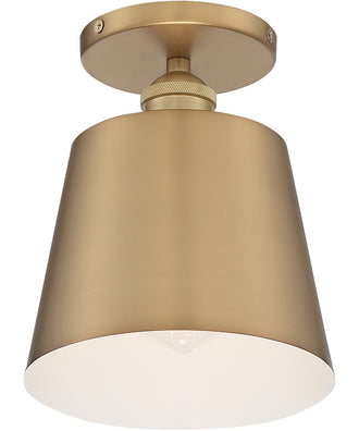 The 7"W Motif 1-Light Close-to-Ceiling fixture by Nuvo Lighting is the epitome of modern elegance. This semi-flush mount light features a sleek, brushed brass finish complemented by white accents, creating a sophisticated look that enhances any space. The conical shape of the brass and white steel shade adds a touch of contemporary design, making it a versatile addition to various interior styles.