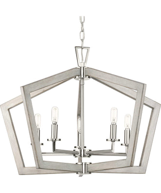 Clean, modern lines combine with rustic elements in the Galloway Collection. A lightly distressed grey washed oak finish highlights an open, angular frame suspended from an adjustable chain and simple round canopy, all finished in subtle brushed nickel. Brushed nickel columns hold candelabra lights that glow brightly within the stately form to illuminate spaces in a casually elegant style. The smaller chandelier is a perfect size to install over tables and islands and offers ideal task lighting for kitchens and dining rooms.