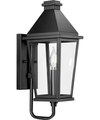 Inspired by vintage glass lanterns, the Richmond Hill Collection has a slender, tall profile and crisp angular details coated in a classic textured black finish. A stately candle enclosed within clear glass panes highlight's the elongated, tapered design while delivering crisp illumination. The updated traditional design of thiswall lantern offers fresh style to the outdoor patios, porches and other outdoor or indoor settings of modern farmhouse and transitional homes. It is cULus wet location listed for use where water may be present, with a one-year warranty to guarantee your complete satisfaction. Progress Lighting products are designed for exceptional quality, reliability, and functionality.