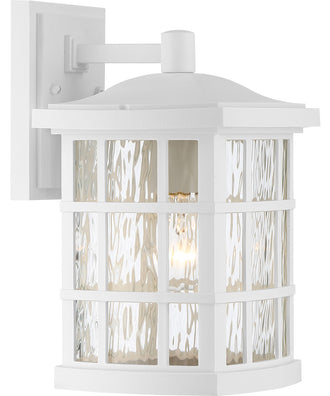 The Stonington wall light boasts several practical features: - A white lustre finish that complements various exterior color schemes. - Clear water glass shade that adds visual interest and enhances illumination. - Weather-resistant Coastal Armour base material for enhanced durability. - Dimensions of 13" height, 9" width, and 8" depth, making it a substantial yet unobtrusive addition to your exterior decor. - A backplate measuring 4.5" width by 6.5" height for secure installation. - Suitable for use with a 100-watt medium base bulb (not included) to provide ample lighting. - ETL and UL listed for outdoor use, ensuring safety and reliability. - Installation direction: Up, for optimal light distribution.