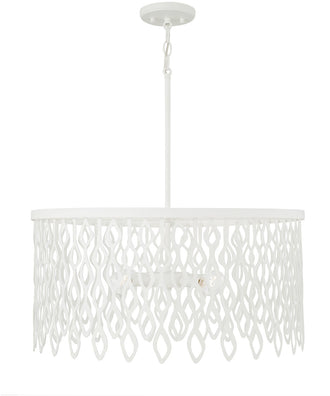 The Phoebe 4-Light Pendant in Matte White is a stunning addition to any modern home. Its elegant design features a cascading laser-cut motif that creates a lace-like effect, adding a touch of sophistication and glamour to your space. The intricate patterns are not only visually appealing but also allow light to filter through beautifully, creating a warm and inviting ambiance.