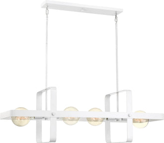 The 42"W Prana 4-Light Pendant in White is a stunning addition to any modern or contemporary space. This elegantly designed fixture features a sleek, white finish that exudes sophistication and style. The minimalist design showcases clean lines and a geometric frame, making it a versatile piece that can seamlessly blend into various room themes. The pendant's rectangular shape is complemented by four exposed bulbs, adding a touch of industrial charm while maintaining a refined aesthetic.