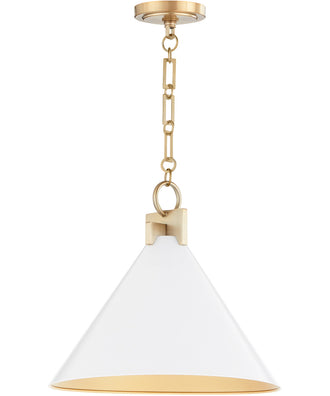 Enhance the aesthetic appeal of your home or office with the exquisite 1-light Pendant in Studio White with Aged Brass. This pendant light from Quorum exudes sophistication and elegance, making it a perfect addition to any space. The conical shape of the shade, combined with the luxurious aged brass finish, creates a stunning visual contrast that is both modern and timeless.