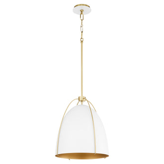 The pendant's Studio White exterior provides a clean, crisp look that brightens any room, while the aged brass finish on the supporting elements adds warmth and depth. The interior of the shade is also finished in a rich brass tone, enhancing the light's glow and creating a welcoming ambiance. This thoughtful design ensures that the pendant not only serves as a functional light source but also as a decorative focal point.