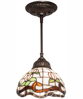 The 7" Wide Roseborder Mini Pendant is a beautiful handcrafted masterpiece from Meyda Tiffany. This pendant light showcases the timeless elegance of stained glass artistry, featuring a delicate rose border design that adds a touch of sophistication to any room. The intricate patterns and vibrant colors of pink, mauve, green, violet, and beige create a stunning visual effect that is sure to captivate your guests.