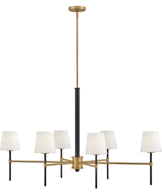 The Saunders 6-Light Medium Six Light Linear chandelier is a striking blend of traditional elegance and mid-century modern design, making it a perfect centerpiece for any room. This exquisite fixture boasts a spoked silhouette that exudes sophistication, while the decorative stem holders add a touch of contemporary flair. The chandelier features a sleek Black finish complemented by Lacquered Brass accents, creating a stunning contrast that enhances its visual appeal.