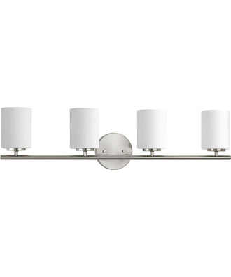Ideal for a bathroom. Perfect for modern and transitional style settings. Beautiful brushed nickel finish. Elegant etched painted white glass shades. Mount the light fixture facing up or down. Use 4 medium base bulbs that are sold separately (100 W max - LED/CFL/incandescent). compatible with dimmable bulbs. Measures 31.125-inch width by 7.875-inch height by 6-inch (extends from wall). Certifications: UL-CUL Damp Location Listed. Pairs with the Alexa, Tobin, and Markor collections by Progress Lighting. Our 1-year Limited Warranty guarantees your complete satisfaction with your purchase and includes professional after-sales customer service support.