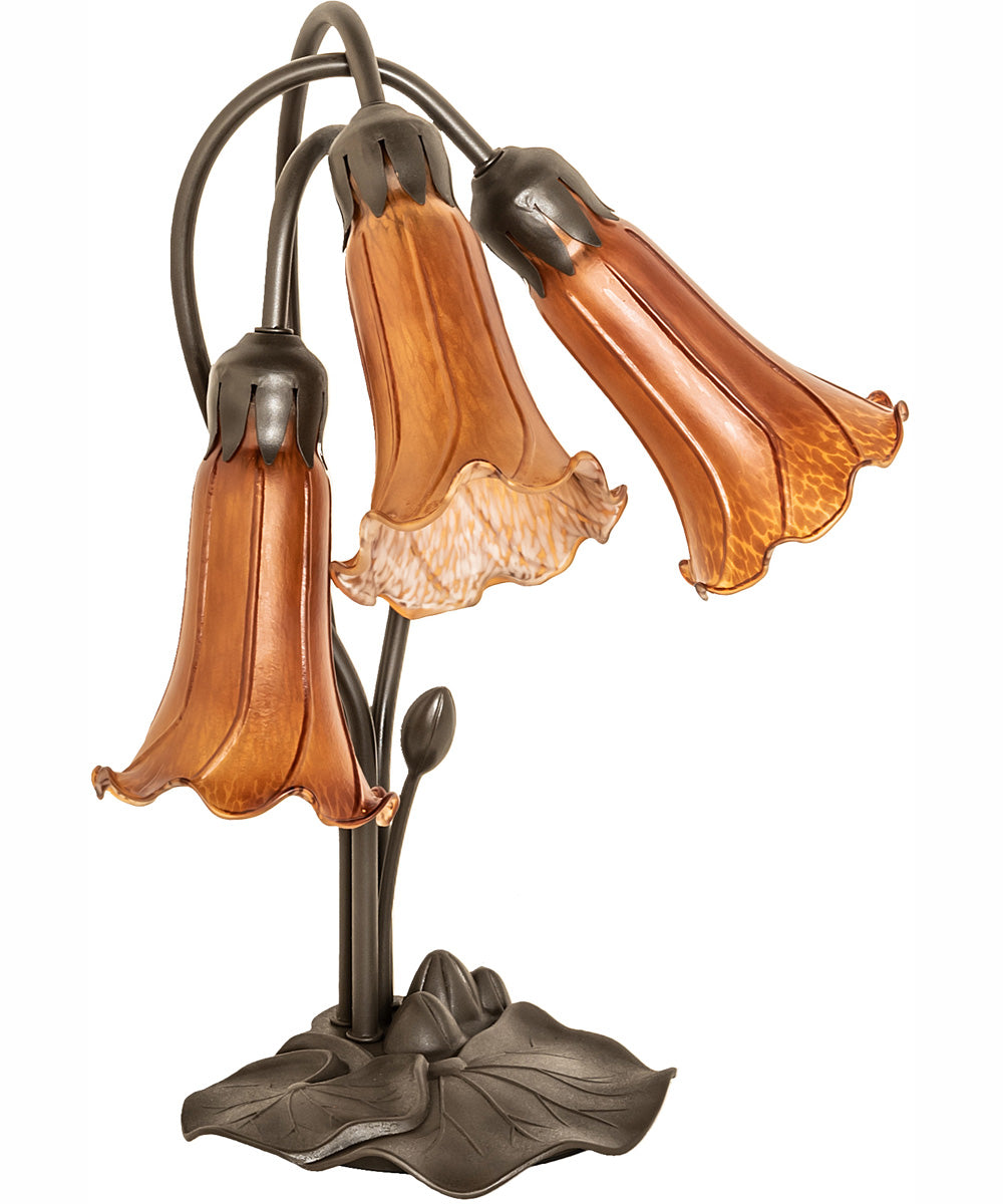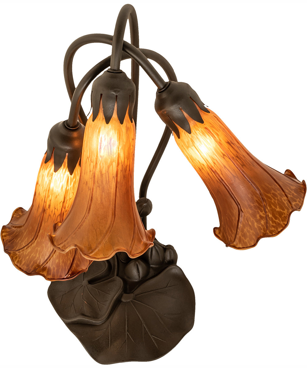 The 16" High Amber Tiffany Pond Lily 3 Light Accent Lamp is versatile and can be used in various rooms and settings. Its classic design makes it ideal for traditional, vintage, or eclectic room themes. Place it on a side table in your living room to create a focal point, or use it as a bedside lamp in your bedroom for a touch of elegance and warmth. It also works beautifully in a study or office, adding a sophisticated charm to your workspace.
