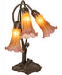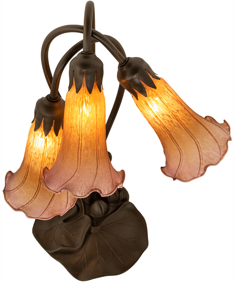 The 16" High Amber/Purple Tiffany Pond Lily 3 Light Accent Lamp is a beautiful recreation of the popular Tiffany design from the early 1900s. This exquisite table lamp features three stunning Amber and Purple art glass shades that resemble delicate pond lilies, adding an air of elegance and sophistication to any room. The shades are embraced by an elegant cast metal base, finished by hand in Mahogany Bronze, which not only enhances its vintage charm but also ensures durability and longevity.