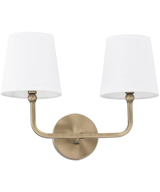 The Dawson 2-Light Vanity in Aged Brass is the epitome of timeless elegance and sophisticated design. This exquisite vanity light features a classic aged brass finish that exudes a warm, inviting glow. The soft, visual texture of the aged brass adds a touch of vintage charm while maintaining a contemporary appeal. The decorative fabric shades are meticulously crafted to guide the flow of light, creating a harmonious balance between functionality and aesthetics.