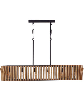 The Archer 6-Light Island Light in Wood and Matte Black is a stunning addition to any home, offering a unique sculptural style that captivates from every angle. This linear chandelier pendant features artisan-crafted slats of mango wood, creating a visually intriguing wave that appears to be in motion. The light wood finish of the mango wood contrasts beautifully with the powder-coated matte black metal frame, adding a touch of modern sophistication to its rustic charm.