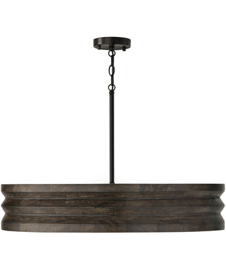 The chandelier's main body showcases a deep, dark brown stain that highlights the natural grain of the mango wood, giving it a warm and inviting appearance. The matte black metal accents add a touch of industrial elegance, making this fixture a perfect fit for both traditional and contemporary settings. The smooth, mixed material finish ensures that the chandelier stands out as a focal point in any room.