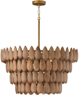 The Ravi 4-Light Pendant Light in Wood and Patinaed Brass is a stunning addition to any home. Featuring a captivating cascading silhouette, this pendant light is adorned with handcrafted mango wood teardrops that create an intriguing dimension. The natural variation in the wood ensures that each piece is unique, adding an artisan touch to your space. The hand-distressed Patinaed Brass finish adds a lustrous shine, enhancing the overall elegance of the fixture.