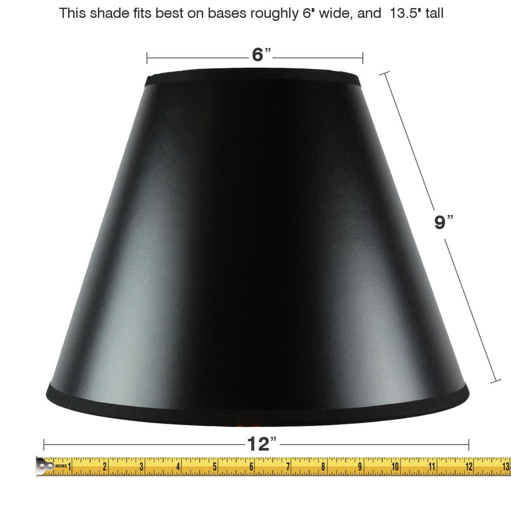 The 6x12x9.5 SLIP UNO FITTER Bold Black with True Gold Lining Hard Back Empire Lampshade boasts a classic empire shape that tapers gracefully from a 12-inch bottom diameter to a 6-inch top diameter. Its sleek, bold black finish on the exterior exudes sophistication and modern elegance, making it a versatile addition to any room. The true gold lining inside adds a touch of luxury and warmth, creating a beautiful contrast that enhances the overall aesthetic of the lampshade.