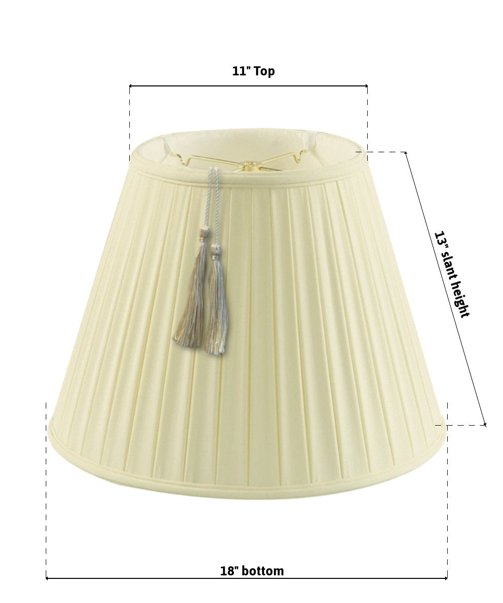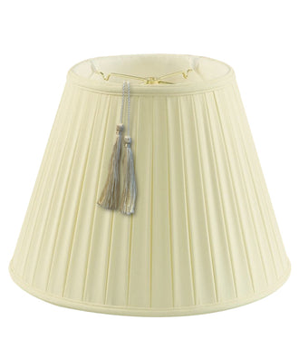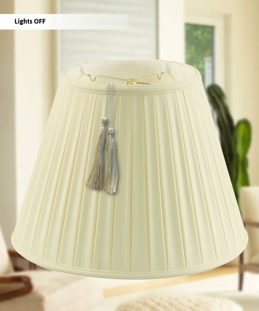 Enhance the ambiance of your living space with our exquisite 18"W x 14"H Empire BoxPleat Shantung Lamp Shade in a sophisticated eggshell color. Crafted with meticulous attention to detail, this lamp shade features a classic empire shape with a box pleat design, adding a touch of timeless elegance to any room. The durable upholstery-quality shantung fabric ensures that the shade will maintain its beauty and integrity for years to come, resisting brittleness from smoke or sunlight.