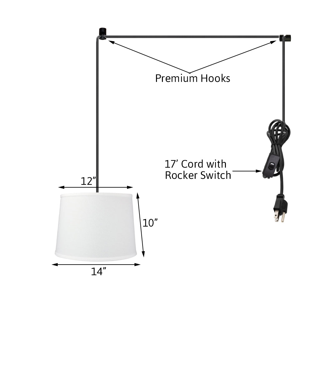 The 14"W 1 Light Swag Plug-In Pendant with a white shade and black cord is the epitome of modern elegance. Its sleek, minimalist design features a crisp white fabric shade that exudes a clean and sophisticated look, making it a perfect addition to any contemporary or classic interior. The cylindrical shade measures 12" at the top, 14" at the bottom, and has a slant height of 10", providing ample light diffusion for a warm, inviting ambiance.