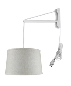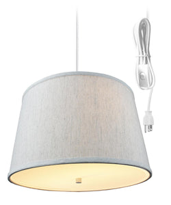 The 14" Wide 1 Light Swag Plug-In Pendant features a shallow drum shade that exudes a timeless elegance. The textured oatmeal fabric adds a touch of sophistication, making it a versatile addition to any room. The shade's dimensions are carefully designed, measuring 14 inches at the top, 16 inches at the bottom, and 10 inches in height, providing a balanced and aesthetically pleasing look.