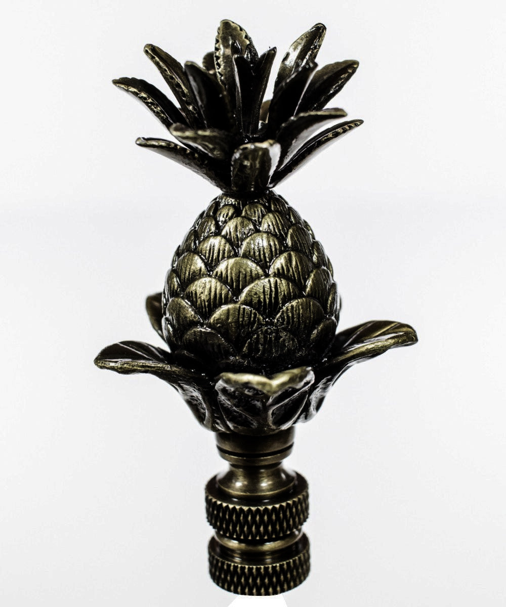 A new Blossoming Pineapple lamp finial is the perfect way to complete your new or favorite lamp. The Pineapple symbolizes: Warmth, Welcome, Friendship and Hospitality.  Place this pineapple atop your favorite lamp will keep you continually aware of its influence. A new lamp finial is the perfect way to complete your new or favorite lamp. Quality finial that is sure to dress up your tired lamp. Finials have a standard 1/4"-27 thread, which will fit the harp on almost every lamp. (This means the opening is 1/4" wide and there are 27 threads per inch.) 95% of all lamp harps will fit this finial. Material: Antiqued Brass finish with Antiqued Brass Base. Finial measures 3" height x 2" width.