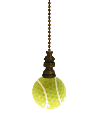 Show your love for the game with this Tennis themed fan pull. Your guests will know you are a true tennis fan when they notice your new yellow tennis ball hanging from your favorite ceiling fan. A new ceiling fan pull is the perfect way to personalize your ceiling fan. All Home Concept fan pulls have a protective lacquer coating to prevent tarnishing or discoloration. Fan pull has a beaded metal chain, compatible with most ceiling fans. Chain measures 12" length (and can be cut shorter), 2.75" height and 1.68" width. Material: Antiqued Brass finish