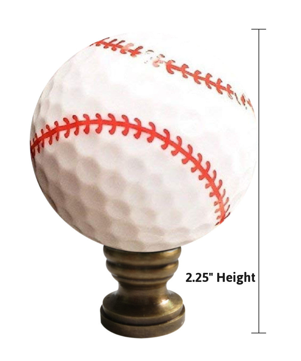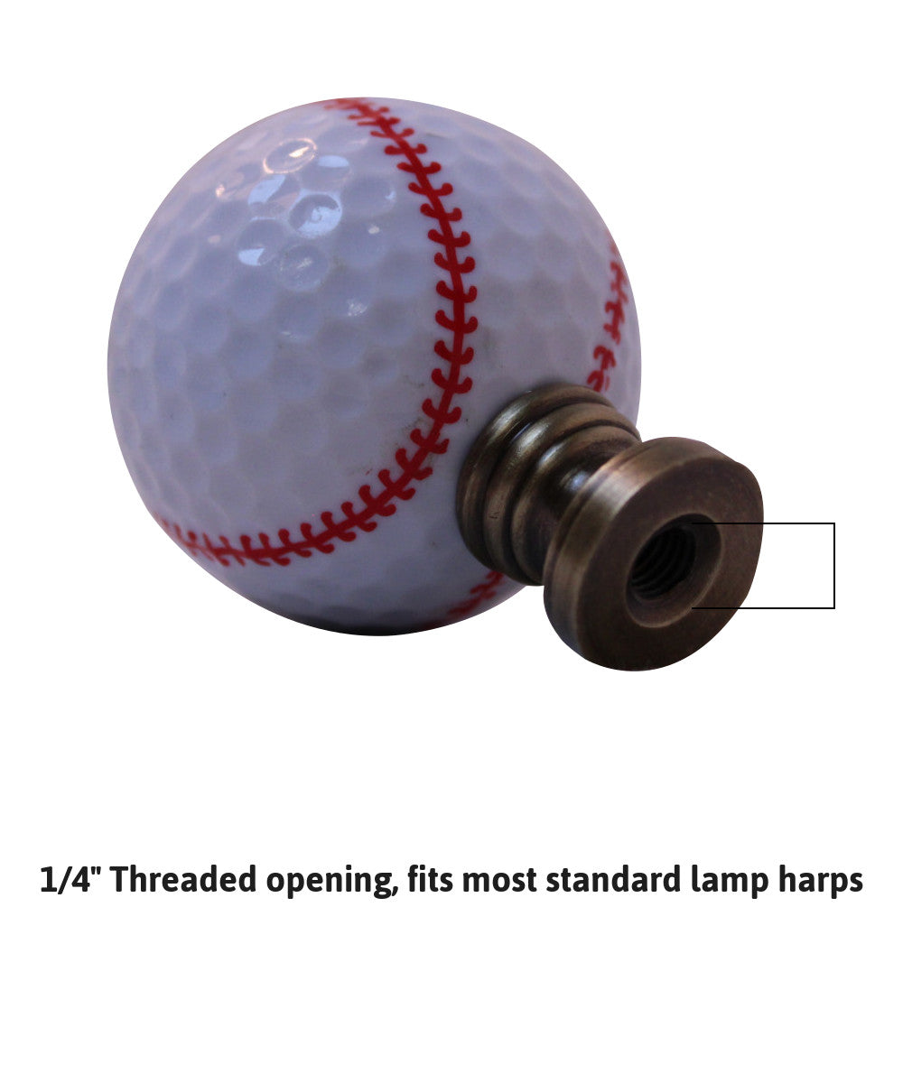 Show your love for the game with this Baseball themed lamp finial. Your guests will know you are a true baseball fan when they notice your new finial sitting atop your favorite lamp. A new lamp finial is the perfect way to complete your new or favorite lamp. All Home Concept finials have a protective lacquer coating to prevent tarnishing or discoloration. Finial has a standard 1/4"-27 thread, which will fit the harp on almost every lamp. (This means the opening is 1/4" wide and there are 27 threads per inch.) 95% of all lamp harps will fit this finial. Finial measures 2 1/4" Height and 1.68" width. Material: Antiqued Brass finish