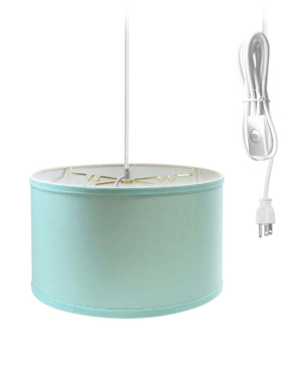 Elevate the ambiance of any room with the 1 Light Swag Plug-In Pendant featuring a stunning Island Paradise Linen Drum Shade. This pendant light boasts a sleek, modern design with a cylindrical drum shade that measures 16 inches in diameter and 9 inches in height. The shade is crafted from premium fabric in a refreshing aqua blue color, adding a burst of vibrant yet soothing color to your space. The clean lines and simple silhouette make it a versatile addition to various interior styles, from contemporary to coastal themes.