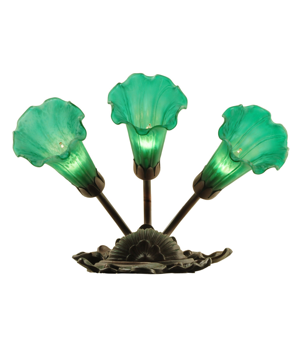 One of the most popular Louis Comfort Tiffany styled lamps on the market today; recreating his famous Favrile design from the early 1900's. This softly mottled Emerald Green shaded Three Light Wall Sconce offers an attractive; delicate design featuring shades mouth blown of fine art glass. Lily shades are suspended from stems delicately winding above a Lily pads fixture finished by hand in Mahogany Bronze.