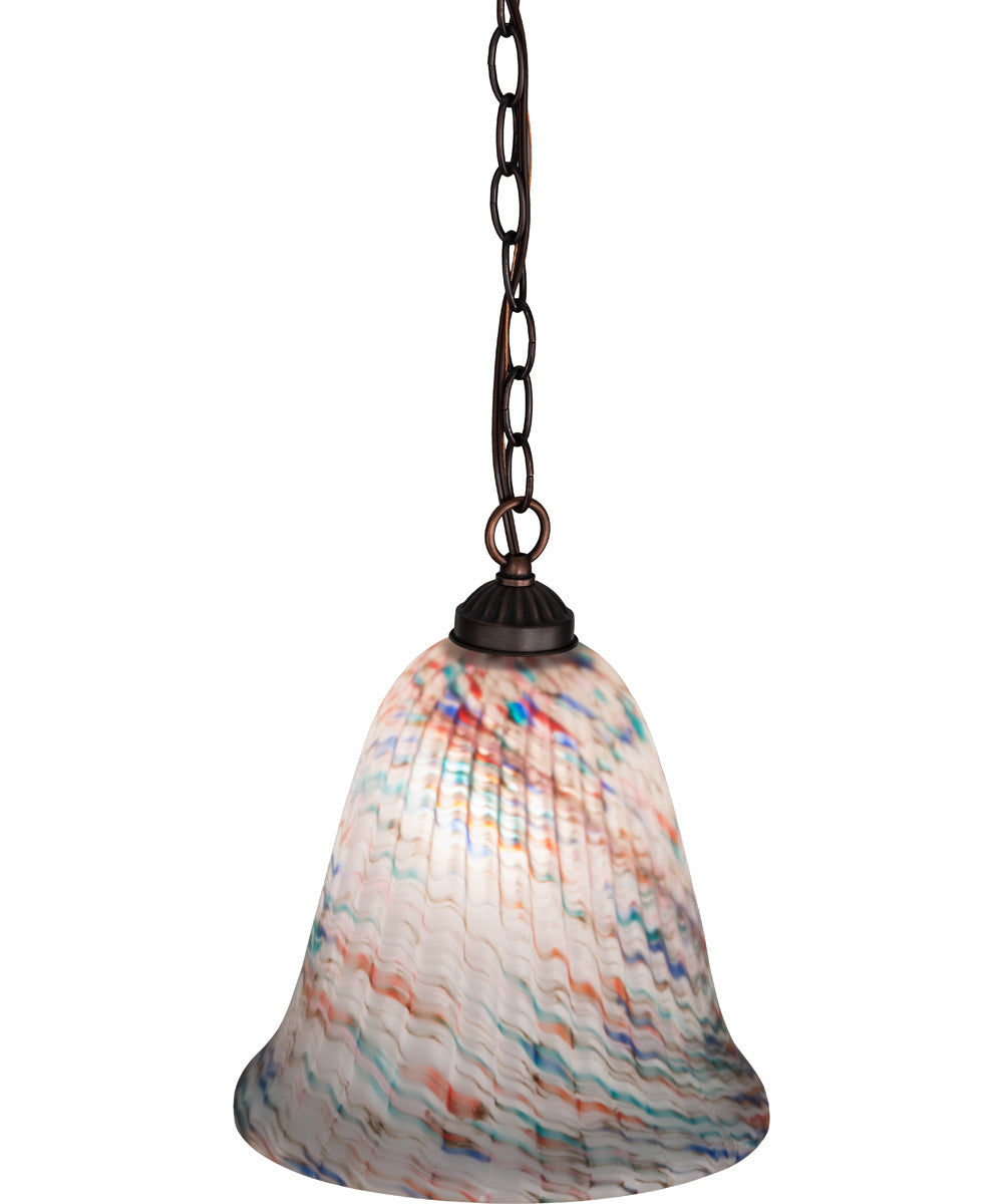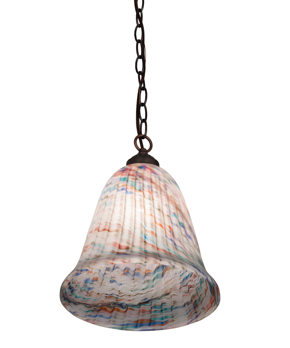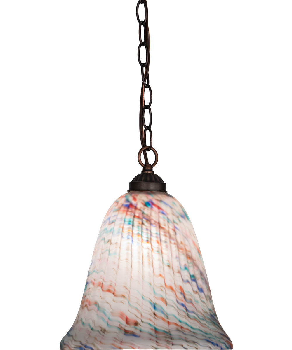 The 11" W Peacock Pate-De-Verre Pendant is a stunning piece of art that brings a touch of elegance and sophistication to any room. This pendant light features a graceful bell-shaped profile, meticulously crafted from mouthblown art glass. The multicolored brushstrokes on a frosted clear glass background create a mesmerizing visual effect, reminiscent of a peacock's vibrant plumage. The hardware is finished in a warm Mahogany Bronze, adding a rich and luxurious touch to the overall design.