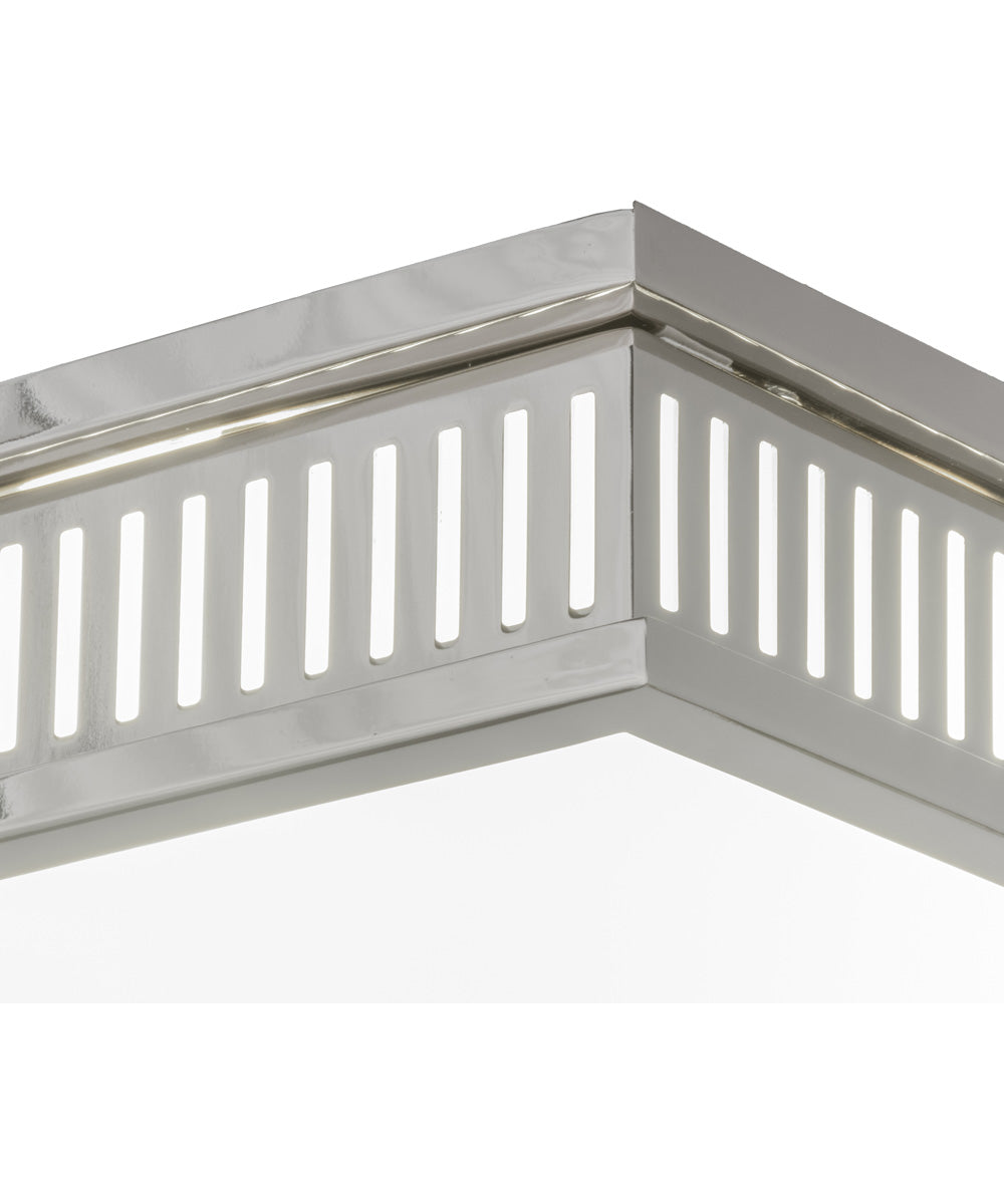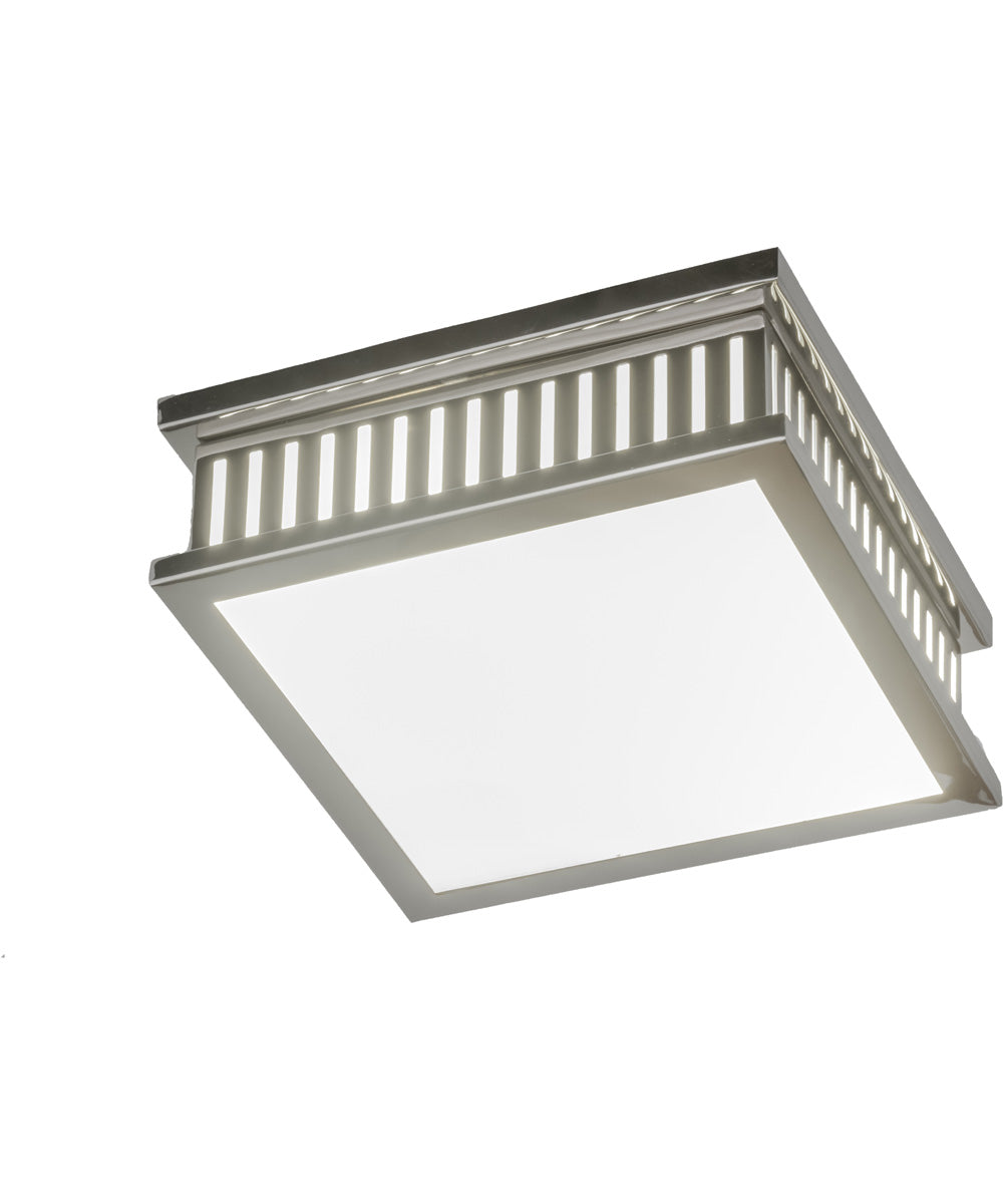 Inspired by tooth-like Dentil block patterns used in Doric; Ionic and Corinthian orders of classic Greek and Roman architecture; this fixture features a grooved design. A unique industrial design is brought home with Polished Nickel finished stainless steel hardware. A Frosted White glass lens evokes ambient lighting for kitchens; hallways; closets and foyers. The fixture is handcrafted in the USA by highly skilled artisans. Custom sizes; styles; colors and dimmable energy efficient lamps are available.