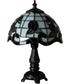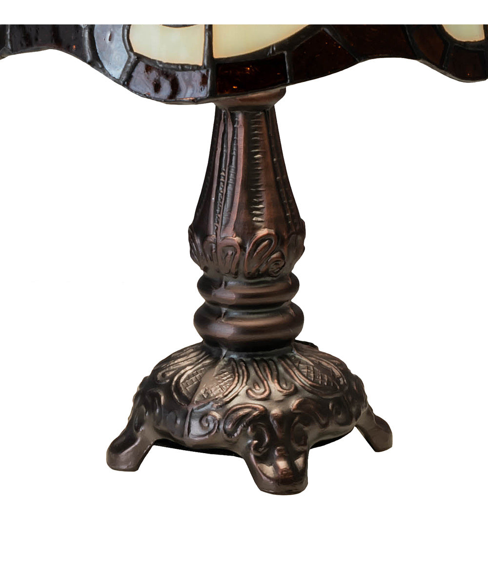 The 12"H Roseborder Mini Lamp is a stunning piece that brings a touch of elegance and timeless charm to any room. This exquisite lamp features a beautifully crafted shade made from hand-cut, copper-foiled stained glass. The intricate gridwork of Bone Beige glass is adorned with a Rootbeer granite border, showcasing swirling ribbons and perfect Burgundy rosebuds. This classic Tiffany-style design is complemented by a Mahogany Bronze, hand-finished lamp base, adding to its sophisticated allure.
