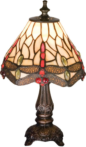 The 12"H Tiffany Hanginghead Dragonfly Mini Lamp is a stunning piece of art that combines functionality with timeless beauty. This exquisite lamp features scarlet dragonflies with glowing jeweled eyes and filigree-topped amber wings, diving over a bone beige background dappled with scarlet, clear, and amber jewels. The intricate design is finished in a warm, hand-applied mahogany bronze, making it a perfect addition to any room.