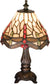 The lamp's color palette is a harmonious blend of rich hues. The bone beige background provides a neutral canvas for the vibrant scarlet, clear, and amber jewels. The mahogany bronze finish on the base complements the stained glass shade, adding a touch of sophistication to the overall design. This combination of colors and finishes makes the lamp versatile enough to fit into various room themes and styles.
