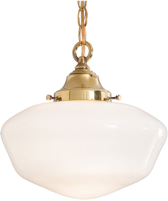 Revive the charm of yesteryears with the 12" Wide Revival Schoolhouse Traditional Globe Pendant. This exquisite ceiling pendant light features a beautifully formed White Opal Schoolhouse Glass shade that exudes a classic elegance. The fixture is complemented by Solid Brass hardware, meticulously finished with a Hand-Polished Premium Finish, ensuring a refined and sophisticated look. Inspired by the traditional schoolhouses and public buildings of the early 1920s, this vintage-style lighting fixture brings a touch of historical charm to any space.
