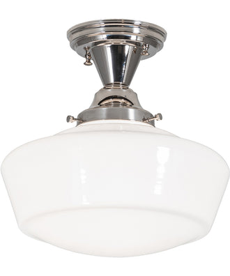 Restore the past with this handsome pendant featuring a beautifully formed White Opal Schoolhouse Glass shade. The fixture is enhanced with Solid Brass hardware featuring a Nickel-plated; Hand-Polished Premium Finish. This vintage-style lighting fixture features a refined yet consistent; distinctive design that originated in traditional schoolhouses and public buildings in the early 1920s. The ceiling fixture is perfect for dining spaces and corridors in structures from Wells; Maine; to Columbia County; New York; to Canaan; Pennsylvania. The Revival Schoolhouse Traditional Globe Semi-Flushmount is included in our American-designed; handcrafted Schoolhouse Lighting Collection. The fixture is UL & cUL listed for dry and damp locations.