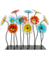 This festive 12 Piece Flower Garden Sculpture is a colorful addition to any room's decor. The generously sized sculpture features a grouping of round floral plates. Each plate begins with clear Favrile art glass into which our artisans have embedded bright yellow, red blue, and amber tones with black dotted centers. Because the Favrile process embeds the color within the glass itself, please allow for subtle variation in color and texture. Each flower is mounted on a black metal stem in various heights on a matching rectangular base. A perfect centerpiece on a dining, coffee, or console table, our Flower Garden Sculpture also makes a wonderful gift or any occasion.